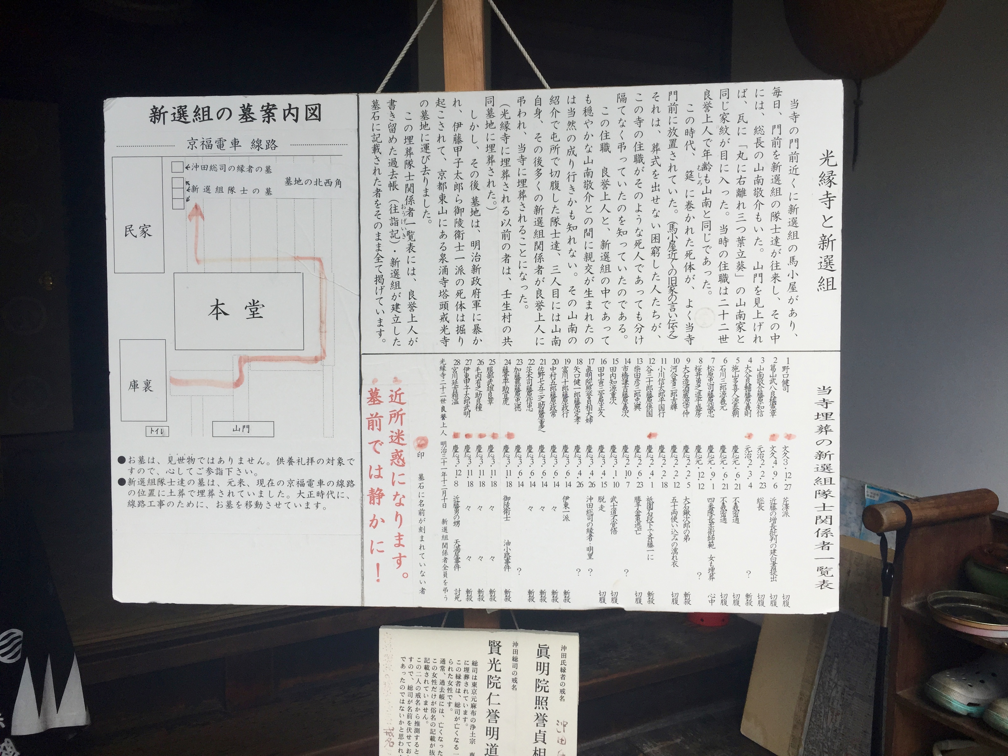 山南敬助、河合耆三郎、松原忠司、谷三十郎、そして野口健司など数多くの新選組隊士が眠るお寺です。沖田家縁者と記されたお墓もあり、「京都で恋仲になったものの添い遂げることができなかった娘さんではないか?と言われいてる」との説明がありましたが、これが通説なのかどうか、私には知識がなくて分かりません。