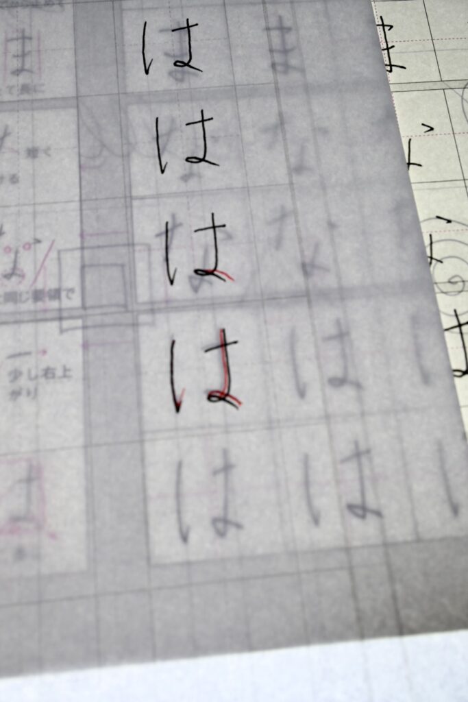 右払いが苦手で、角度が違ったりするのも混乱の素だし、力の抜き方が全然分からない…小さく結ぶ部分「は」「ま」「な」も書けないし、「よ」もとっても苦手。「え」も難しいし…という感じで、ほとんどの文字がお手本とは似ても似つかない字になりがち。
