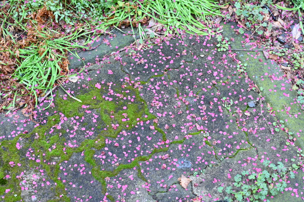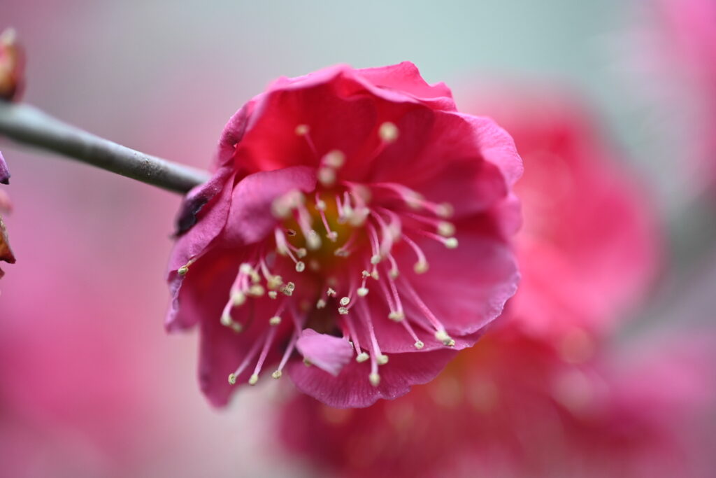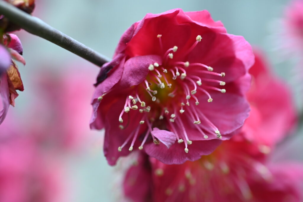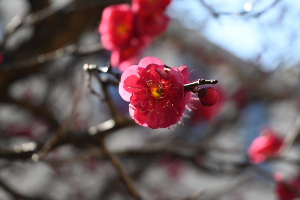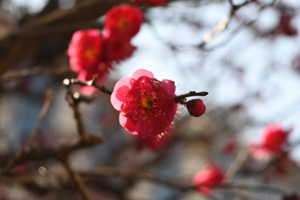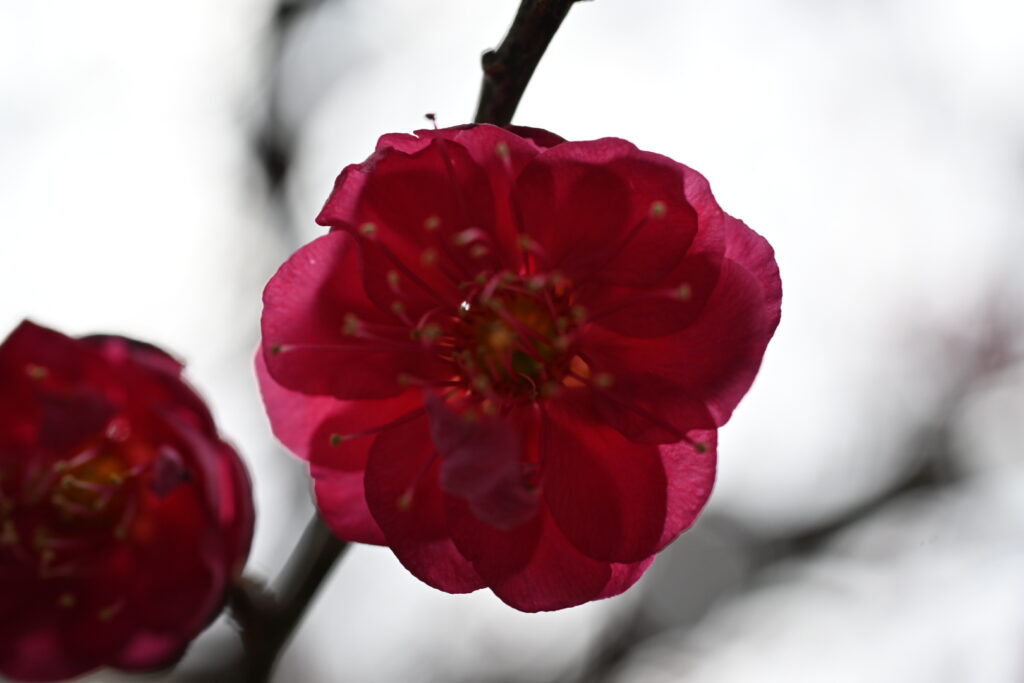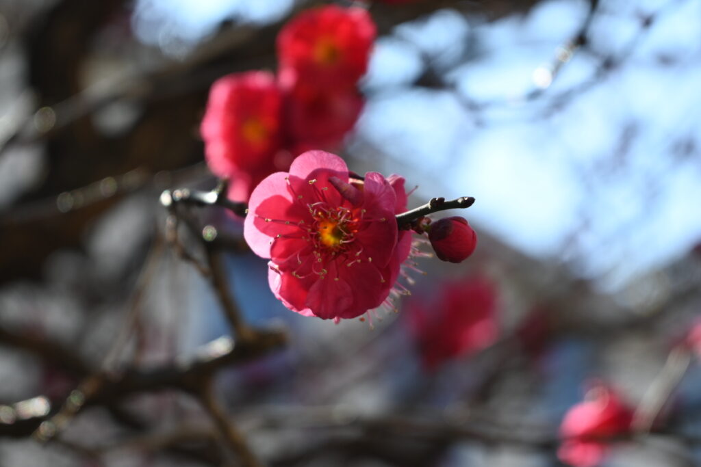 結構風が強くて花が揺れていたのと、紅梅はここ数日の強風と雨でかなり散ってしまいました。